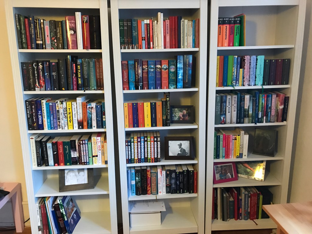 I have three bookshelves at my mom’s house (and another one in the corner of my room but it’s a total mess and I’m not proud of it).