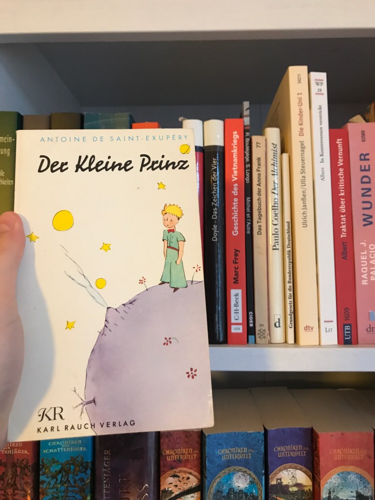 My shortest book is my edition of Antoine de Saint-Exupéry’s Le Petit Prince which we read in German class and preformed in school!